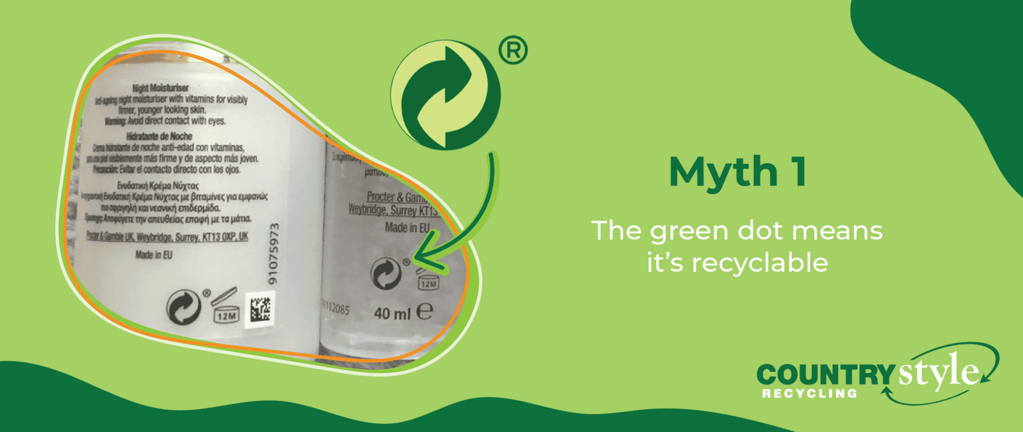 The truth is the green dot symbol (while not always green) does not mean that the packaging is recyclable, will be recycled or has been recycled. It simply is a symbol used on packaging to signify that the company has financially contributed towards the recovery and recycling of the packaging in Europe.